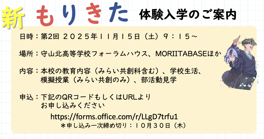 2025年11月15日(土)に守山北高校の学校説明会・体験入学を実施します。