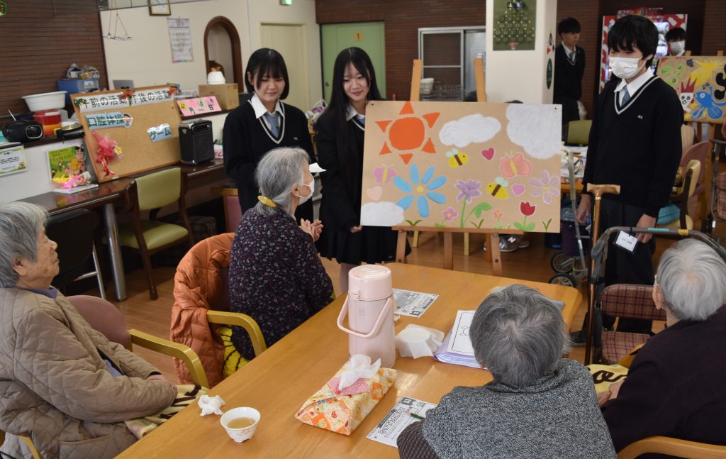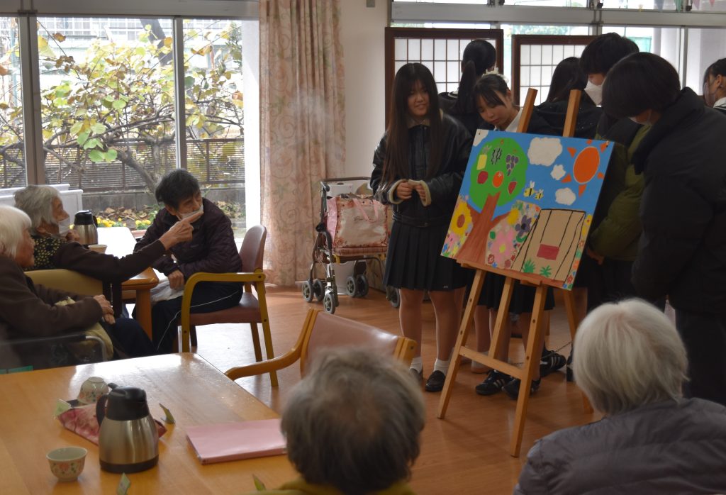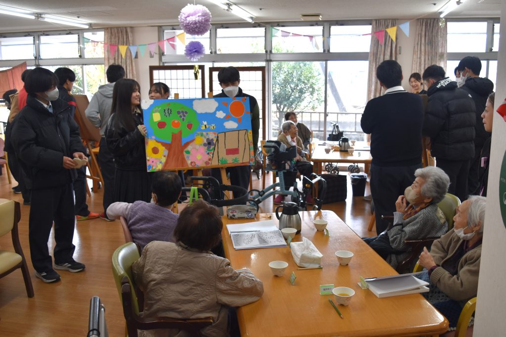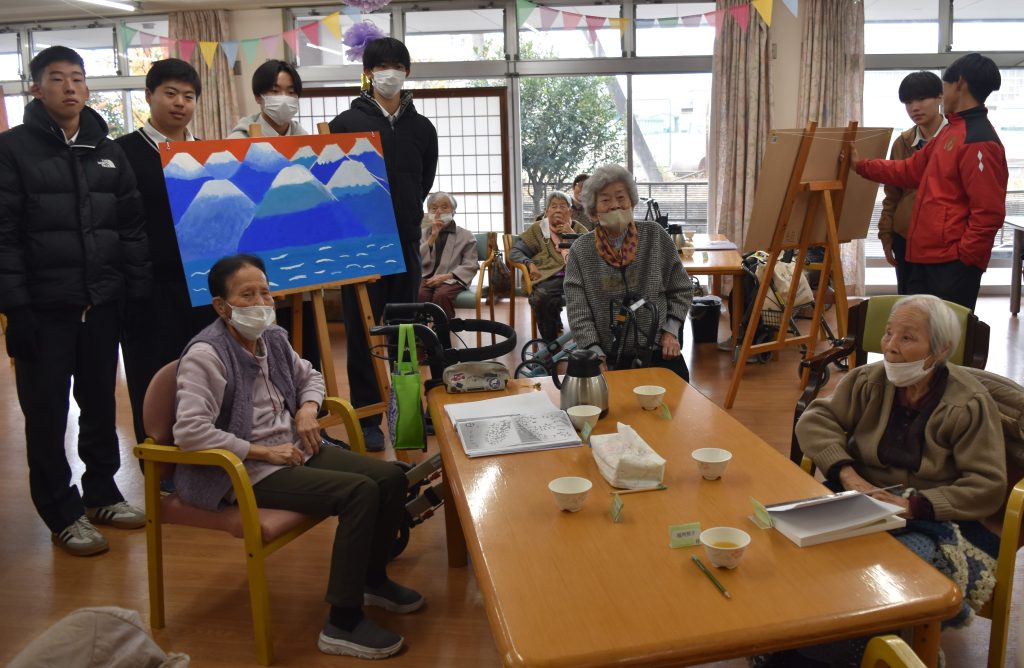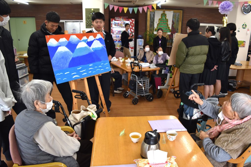 その作品が計9点完成しましたので、作品のお披露目と利用者さんとの交流を行いました。最初のうちは、それぞれの絵を見てもらって感想を聞く生徒達もすこし緊張していたようですが、おじいさんやおばあさん、利用者や施設の方から自分達が予想していなかったことやお褒めの言葉など、たくさんのあたたかな声をかけていただき、だんだんと話し声もにぎやかになり、穏やかで楽しい時間となっていきました。