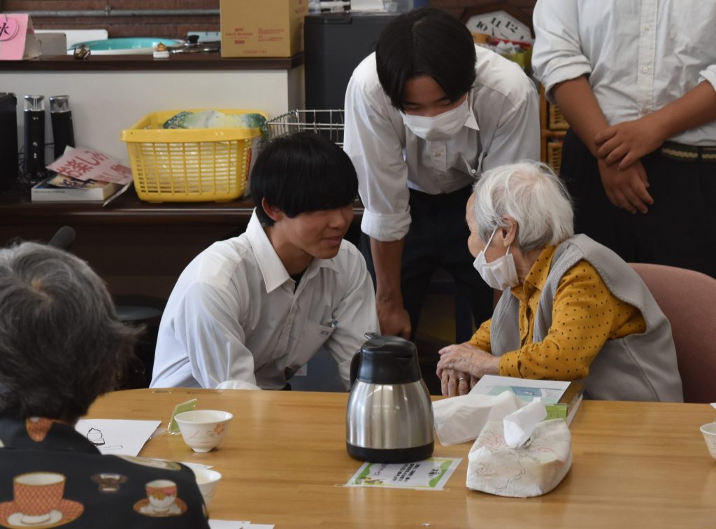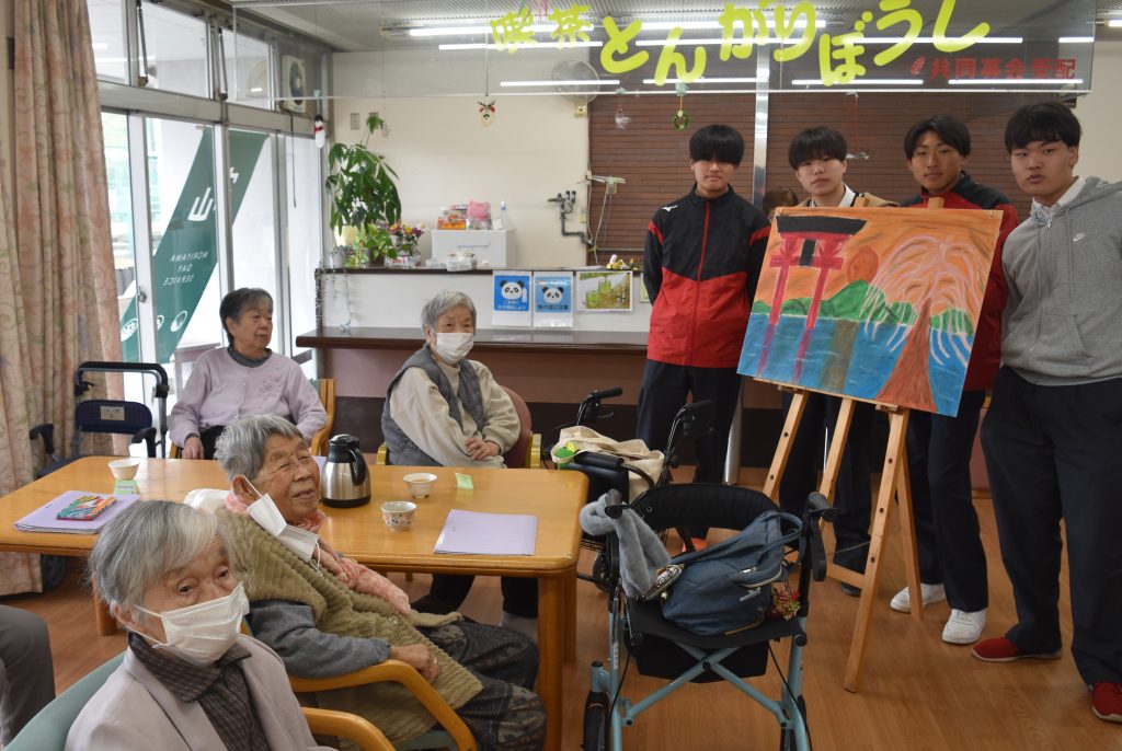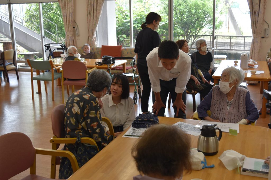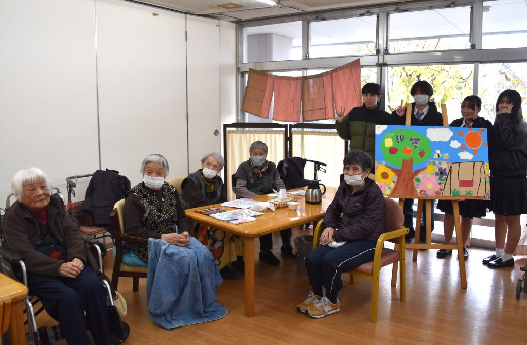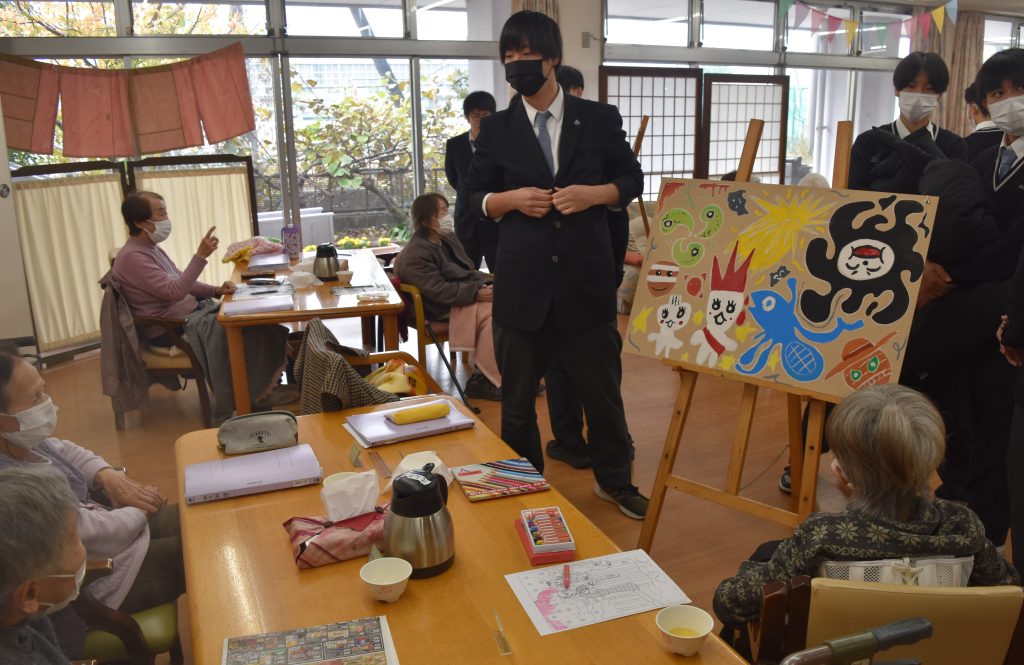その作品が計9点完成しましたので、作品のお披露目と利用者さんとの交流を行いました。最初のうちは、それぞれの絵を見てもらって感想を聞く生徒達もすこし緊張していたようですが、おじいさんやおばあさん、利用者や施設の方から自分達が予想していなかったことやお褒めの言葉など、たくさんのあたたかな声をかけていただき、だんだんと話し声もにぎやかになり、穏やかで楽しい時間となっていきました。