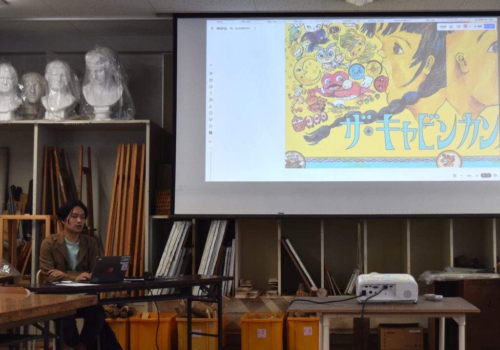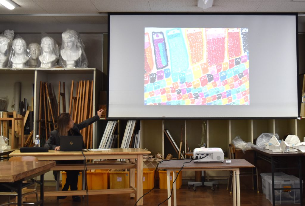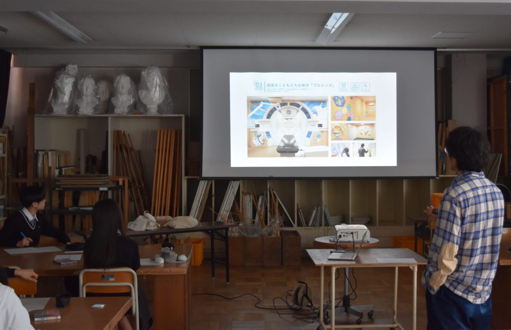 この活動は、1学期には京都芸術大学の由井武人先生から「ホスピタルアート」(病院をアートで飾る活動)について講義を受け、2学期には滋賀県と美術、アール・ブリュットとの関わりや現代の美術について滋賀県立美術館の学芸員山田創さんから、さらには福祉とアート、やまなみ工房の活動について、やまなみ工房施設長の山下完治さんからお話しを聞きました。