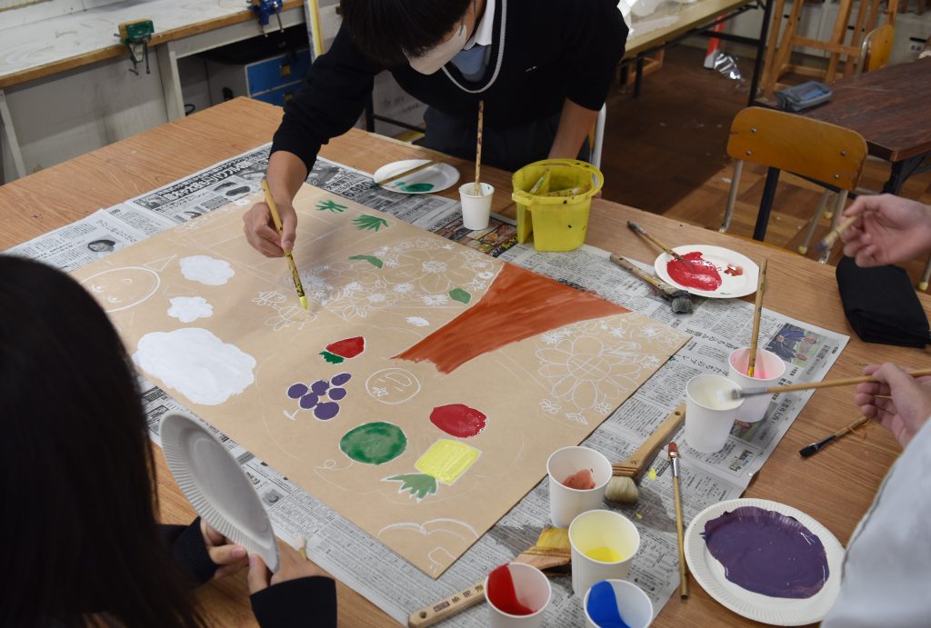 どんなアート作品があれば施設や利用者さんが「ハッピー」=楽しいだろうか…4人程度の班で作品のテーマや内容を話しあい、11月に作品の制作を始めました。