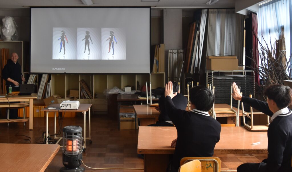 人によって見え方が異なる?…3年生の「総合芸術」(美術)では、京都芸術大学の伊達隆洋先生による「対話型鑑賞」の授業を行いました。アートを「みる・考える・話す・聞く」ワークショップを通して、ものの見方や考え方は人それぞれで、その違いや良さを伝え合うことでお互いの思考や視点が広がることを学びました。