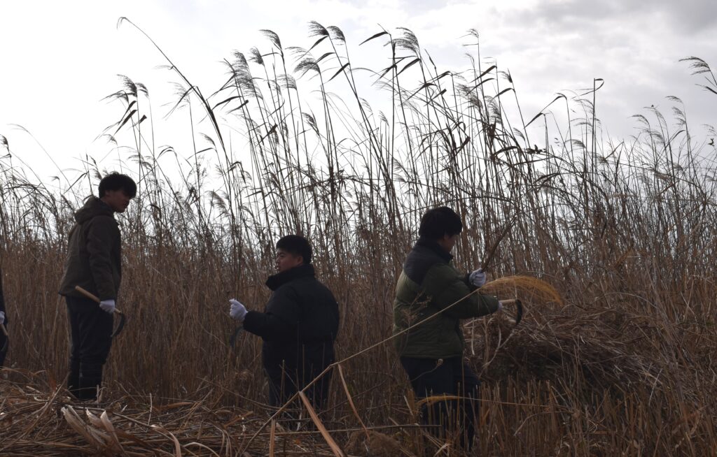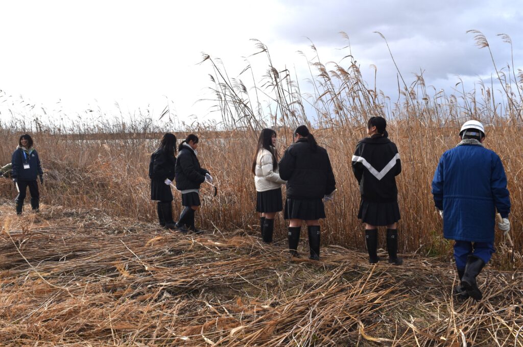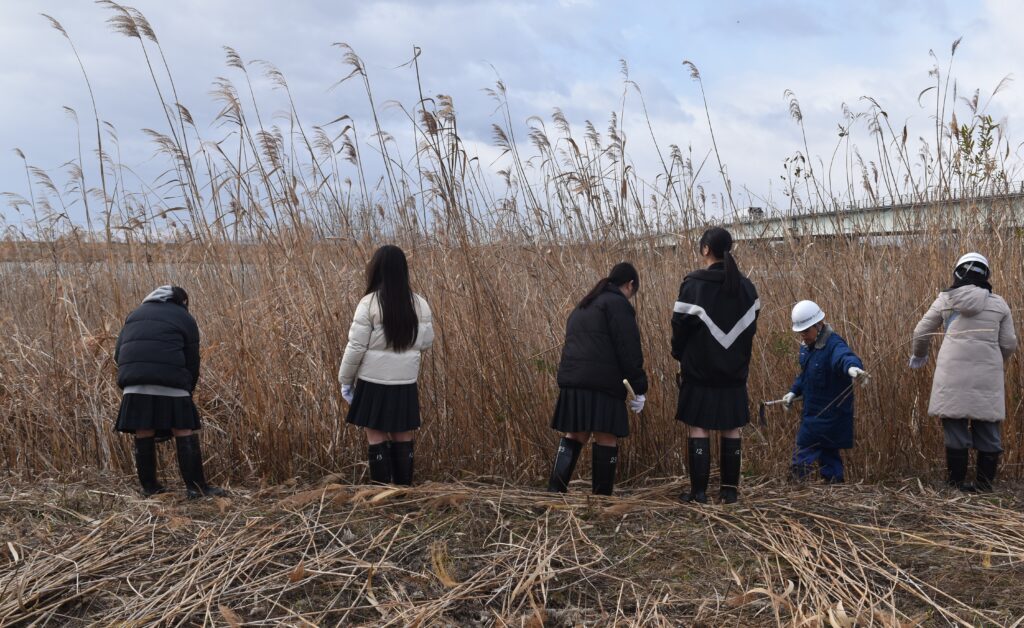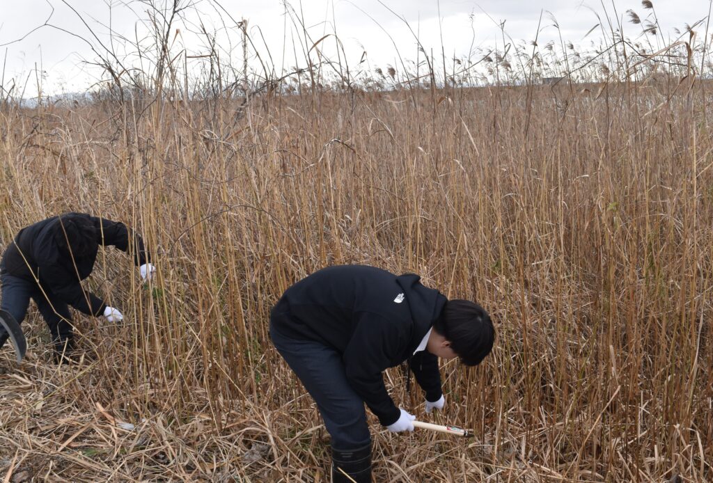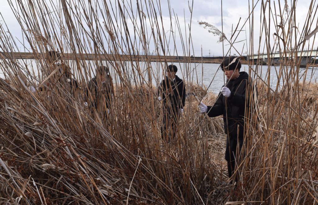 に■1月14日、野洲川の右岸においてヨシ刈りを行いました。最初のうちは、自分の背丈以上の高さのヨシに圧倒されていた生徒も、琵琶湖事務所や守山市環境政策課の方々と一緒に、なれない鎌を持って作業を進めるうちに、すこしづつ刈り方のコツをつかんでいったようです。刈り取られたヨシがどんどん集積場所に集められていきました。