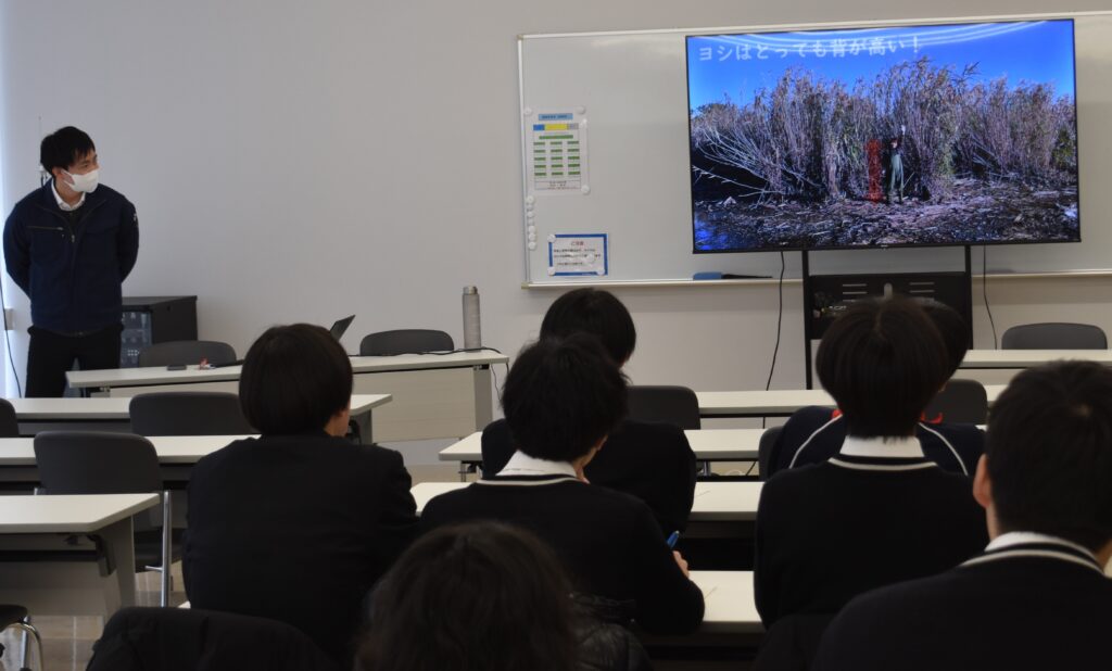 ■2学期には、琵琶湖や野洲川の環境保全やヨシの再生事業について、琵琶湖河川事務所事業対策官の小髙さんからお話を聞きました。ヨシ帯が水質改善や生き物の住処になること、そのヨシを刈ることで再生を促すことなどを学びました。