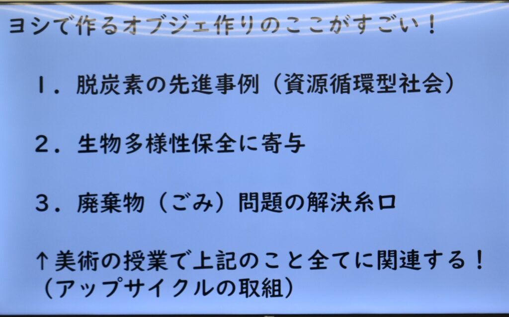 ヨシを焼却炉で焼くとシリカという物質が発生して、炉の内部を痛めるという問題があるそうです。このプログラムはヨシを通して自然、環境や暮らしとの繋がりを知り、さらにヨシを利用して作品を制作することで「社会へメッセージを送る」アートの役割やその意義を、考えるものです。