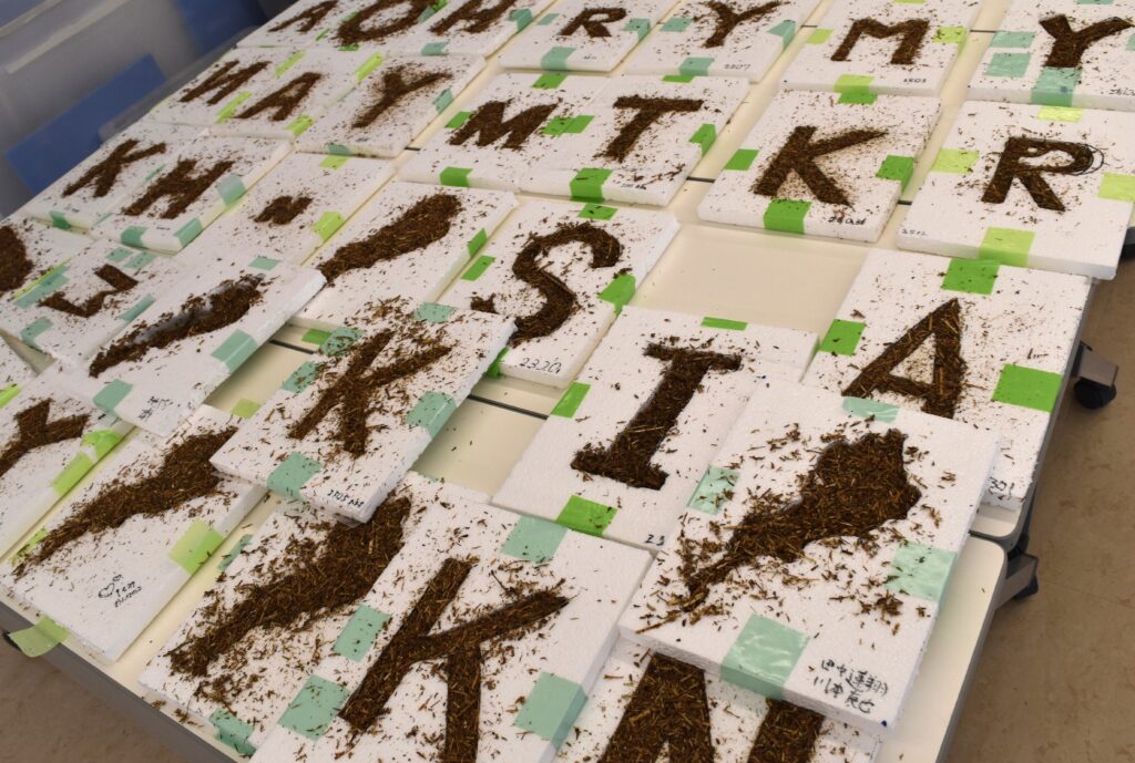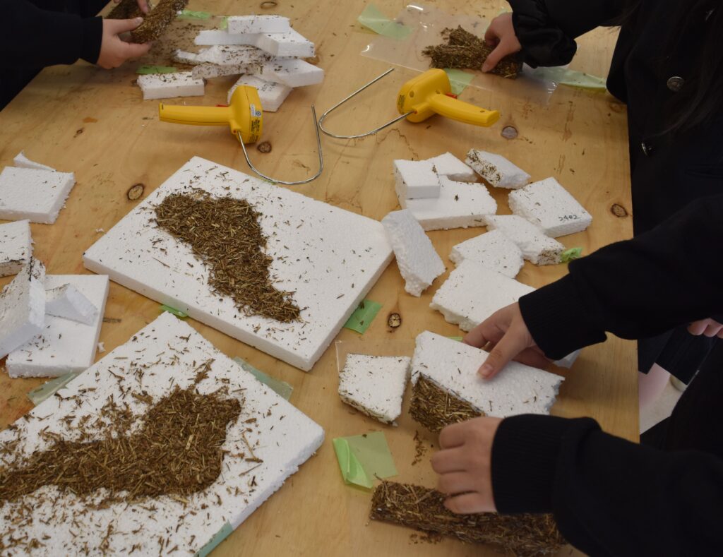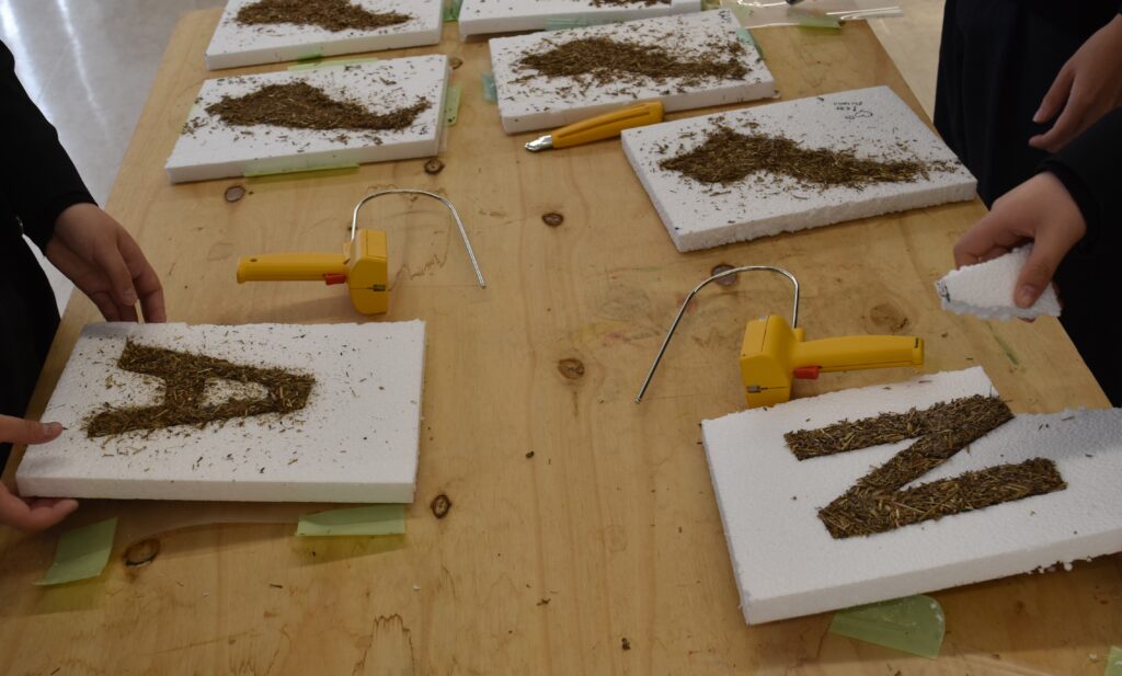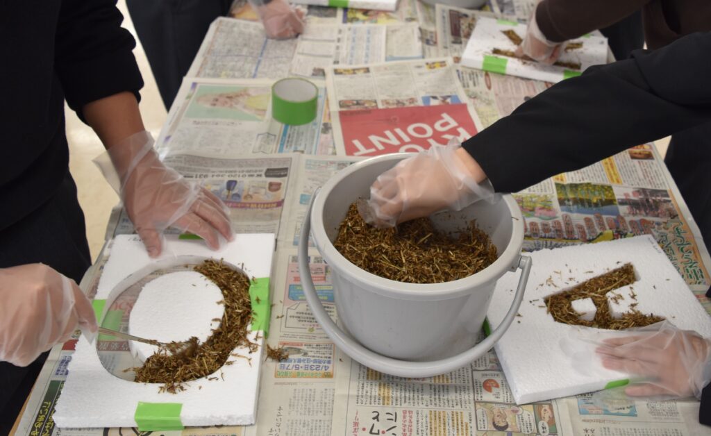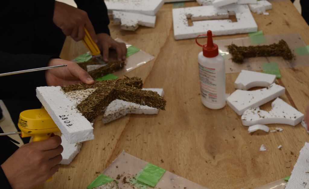 ■1月21日には、守山市のエコパークで、刈り取ったヨシを使ってアート作品の製作を行いました。まずは、発泡スチロールの板に自分の名前のイニシャル一文字を書いて、スチロールカッターで切り抜き、文字の型枠を作ります。細かく粉砕したヨシと無害の樹脂、琵琶湖岸の細かい砂を混ぜ合わせたものを、その型に詰め込みました。