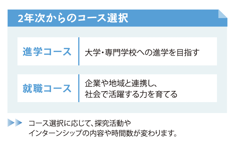 2年次からは、それぞれの進路や関心に応じて2つのコースに分かれます。学びをさらに深め、将来への道を具体的に描いていきます。