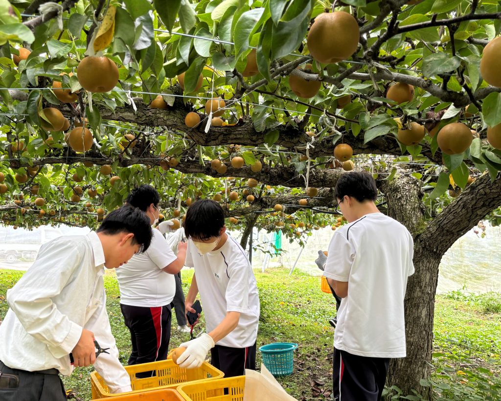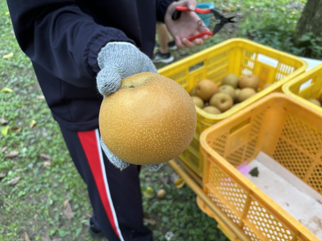 ・夏休みの活動に続き、梨の収穫を手伝わせていただいた。その時とは異なり、収穫出来る梨がとても大きく量も多かったので、大変だったけど、楽しみながら学びの多い活動ができてよかった。